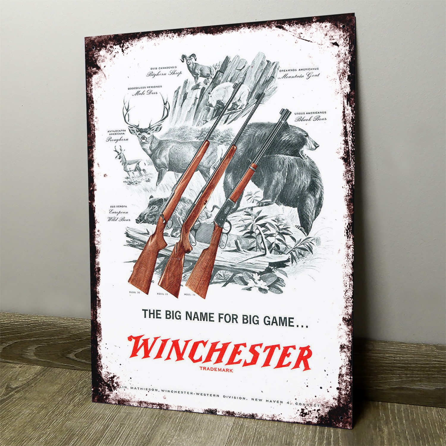 Estampado en la misma chapa, no es vinilo pegado. Viene agujereada en las puntas para amurar.